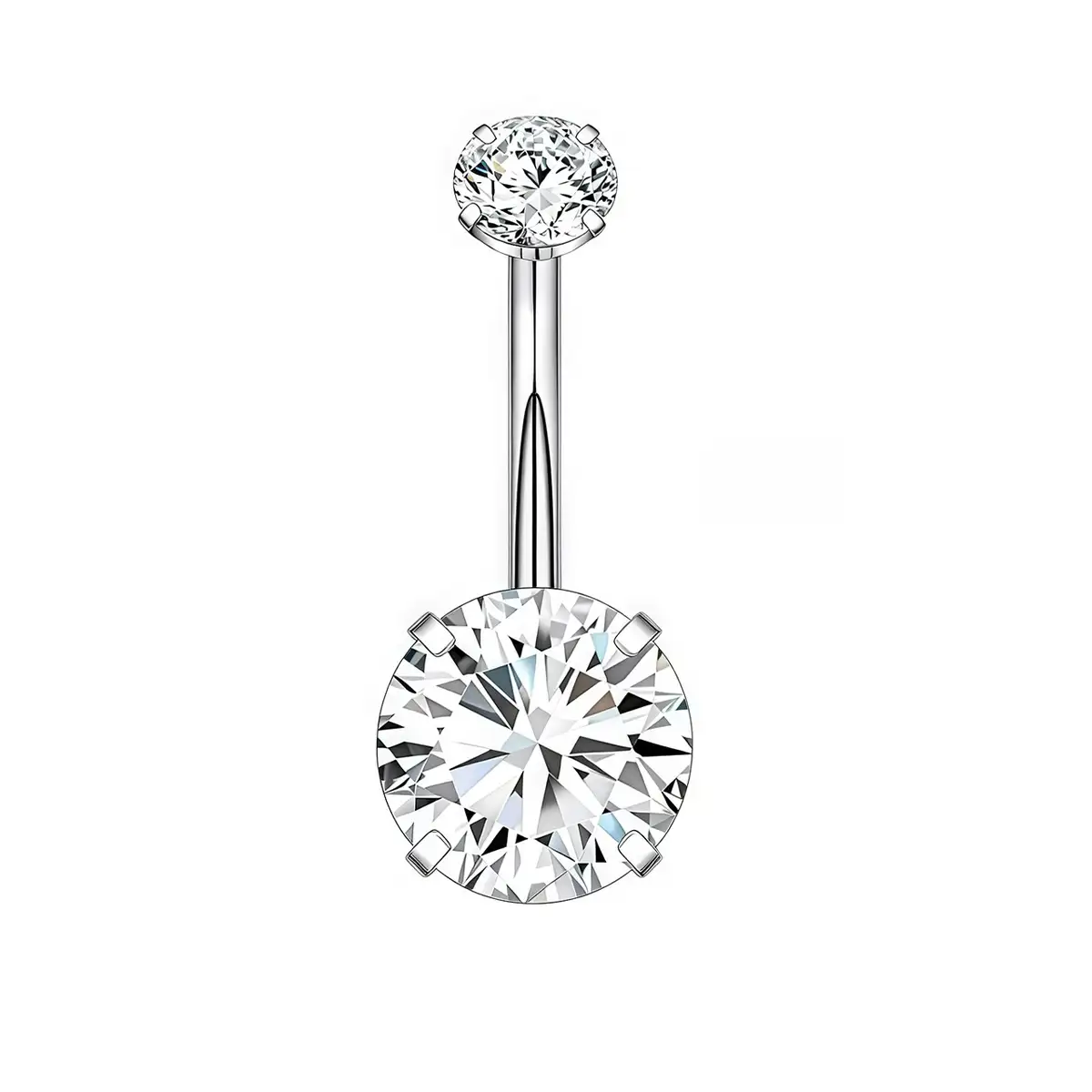 Bauchnabelpiercing aus 304 Edelstahl in silberfarbener Ausführung. Die Oberfläche ist glatt poliert. Das Piercing ist mit zwei runden Zirkonia-Steinen ausgestattet, die in einer geometrischen Fassung eingesetzt sind. Der obere Kugelaufsatz ist verschraubbar und sorgt für sicheren Halt. Das Material ist nickelfrei, korrosionsbeständig und für den dauerhaften Gebrauch geeignet. Geeignet für Alltag und besondere Anlässe.