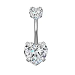 Bauchnabelpiercing aus 304 Edelstahl in silberfarbener Ausführung. Die Oberfläche ist glatt poliert. Das Piercing ist mit einem oberen und unteren herzförmigen Zirkonia-Stein ausgestattet, jeweils in einer mehrkralligen Fassung. Der obere Kugelaufsatz ist verschraubbar und sorgt für sicheren Halt. Das Material ist nickelfrei, korrosionsbeständig und für den dauerhaften Einsatz geeignet. Geeignet für den täglichen Gebrauch.